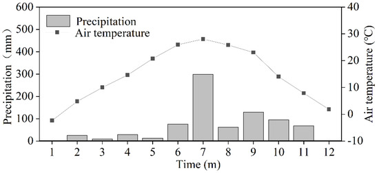 The region experiences a semi-humid continental monsoon climate, which is characterized by a brief rainy summer and prolonged dry seasons in spring, autumn, and winter. A weather station (INSENTEK, Beijing, China) at the study site provided the precipitation and air temperature data in 2021 (Figure 2). The mean annual air temperature was 14.5 °C, while the annual precipitation was 808 mm. Around 61% of the yearly rainfall took place from July to September. Affected by the characteristics of rainfall, there are dynamic changes in the topsoil salt content in this region. During spring, the high evapotranspiration/precipitation ratio results in the gradual accumulation of salt in the soil, and the topsoil salinity reaches its highest value each year. On the contrary, after the concentrated precipitation in summer, due to salt leaching caused by rainfall, the topsoil salinity is at its lowest at that point.