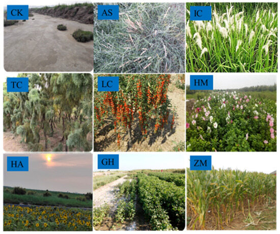 Different types of vegetation at the study site. Note: CK, bare land; AS, Aeluropus sinensis; IC, Imperata cylindrica; TC, Tamarix chinensis; LC, Lycium chinense; HM, Hibiscus moscheutos; HA, Helianthus annuus; GH, Gossypium hirsutum; ZM, Zea mays.