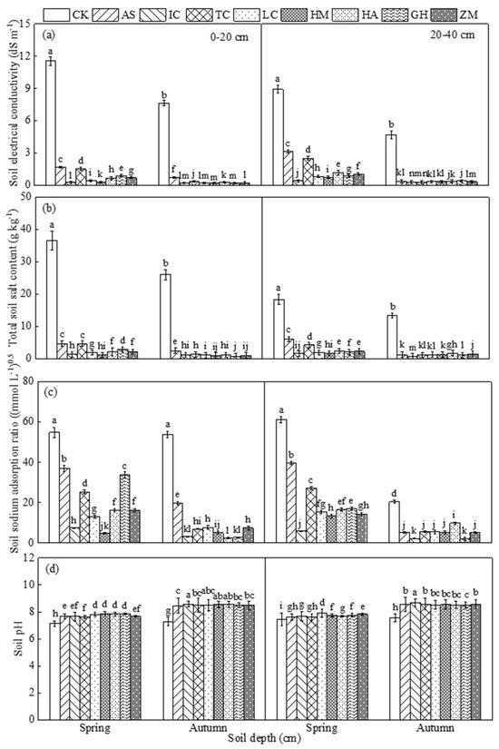 According to Figure 4, the introduction of vegetation considerably reduced the EC of the soil in both the 0–20 cm and 20–40 cm soil layers. Soil with vegetation cover typically had a lower EC than CK, and in both spring and autumn, there was significant variation in the EC between soil under vegetation restoration and CK. For the 0–20 cm soil layer in spring, the EC of the CK land was 11.55 dS m−1, while the EC of the IC land was only 0.26 dS m−1. In addition, there was little difference in the EC between different types of vegetation. Due to the rainfall-induced salt leaching, the EC in autumn was generally lower than that in spring. Moreover, it was found that for CK, the value of EC and TSS in the 20–40 cm soil layer was significantly lower than that in the 0–20 cm soil layer in spring, which suggested salt accumulation at the soil surface. However, after vegetation, more salt was observed in the 20–40 cm soil layer in spring. For example, the TSS of AS and TC in the 20–40 cm layer was significantly higher than that in the 0–20 cm layer. Compared with that in CK, the TSS of the soil in the vegetation-covered areas was generally lower, and there was a significant difference in the TSS between the soils in the vegetation-covered areas and CK at both the 0–20 cm and 20–40 cm soil layers. Vegetation coverage was able to greatly reduce the TSS value of the surface soil, and in the vegetation-covered areas, the difference in the TSS between different soil layers was relatively small (0.8 to 6.1 g kg−1). Compared with that in spring, the TSS of all vegetation types in autumn was lower. At different soil levels, the SAR of CK was much higher than that of the other vegetation types, regardless of whether the season was spring or autumn. In spring, the highest SAR of CK was 61.31% in the 20–40 cm soil layer, compared with only 5.79% for IC. Furthermore, compared with that in autumn, the SAR of different vegetation types was substantially higher in spring. Whether the land was in spring or autumn, the pH of CK was lower than that of vegetation-covered land at the two different soil depths: 0–20 cm and 20–40 cm. The pH of the different vegetation treatments varied very little. In spring, CK had the lowest pH of 7.13 in the 0–20 cm soil layer, while HM had the greatest pH of 7.87; in autumn, CK had the lowest pH of 7.29 in the 0–40 cm soil layer, while IC had the highest pH of 8.67. The pH of the soil in autumn was found to be significantly higher than that in spring, except for bare ground, when the pH of CK and other types of vegetation was compared.