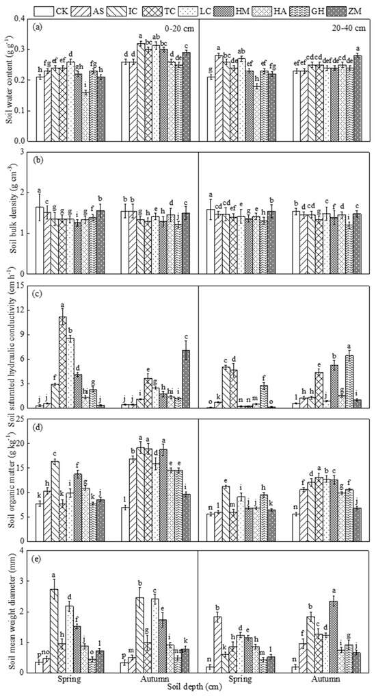 Effects of vegetation types on the soil water content (a), soil bulk density (b), soil saturated hydraulic conductivity (c), soil organic matter content (d), and soil mean weight diameter (e) distributions. Note: Values for each treatment in the same layer that are not labeled with the same letter indicate a significant difference (p ≤ 0.05).