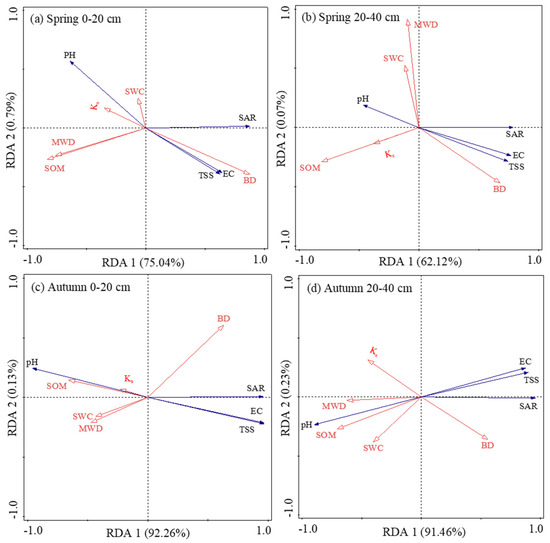 It was found that indicators of soil fertility explained 75.04% and 0.79% of the salinization characteristics of the soil in the first and second axes for the 0–20 cm soil layer in spring (Figure 6a). SAR, EC, BD, and TSS showed a positive association, and pH, Ks, SWC, MWD, and SOM showed a positive correlation. SAR, EC, BD, and TSS had negative correlations with pH, Ks, SWC, MWD, and SOM. We determined the order of the impact of soil fertility indicators on soil salinization by ranking their significance: BD > SOM > MWD > SWC > Ks (Table 2). This suggests that BD was the most significant indicator influencing soil salinity in the 0–20 cm soil layer in spring, followed by SOM. In spring, the correlation among pH, Ks, SWC, MWD, SOM, SAR, EC, BD, and TSS was the same in the soil layer at a depth of 20–40 cm as it was in the 0–20 cm soil layer, as previously indicated (Figure 6b). By evaluating the significance of the soil fertility indicators, we determined that the impacts of various soil parameters on the degree of soil salinization were in the following order: SOM > BD > MWD > SWC > Ks. According to this, BD was the second most significant indication of soil salinity in the springtime 20–40 cm soil layer after SOM. The relationship among pH, Ks, SWC, MWD, SOM, SAR, EC, BD, and TSS for the soil layer at a depth of 0–20 cm in autumn was the same as that observed for the 0–20 cm soil layer indicated above in spring (Figure 6c). The order of the impacts of various soil parameters on the degree of soil salinization was determined by ranking the significance of the soil fertility indicators as follows: BD > SOM > MWD > SWC > Ks. This suggests that BD was the most significant indicator influencing soil salinity in the 0–20 cm soil layer in autumn, followed by SOM. As with the 0–20 cm soil layer in spring, as discussed above, the correlation among pH, Ks, SWC, MWD, SOM, SAR, EC, BD, and TSS was also present at a depth of 20–40 cm in autumn (Figure 6d). We determined the impacts of various soil parameters on soil salinization by ordering the significance of soil fertility indicators as follows: SOM > BD > SWC > Ks > MWD. This suggests that in autumn, SOM was the most important indicator influencing soil salinity in the 20–40 cm soil layer, followed by BD.