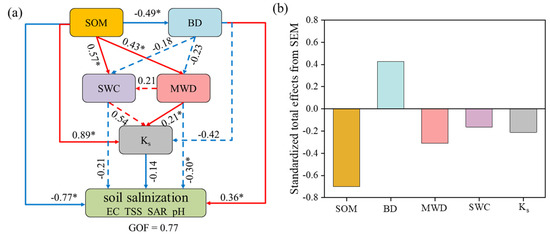 The relationships and mode of importance of soil fertility factors on soil salinization. (a) The structural equation model (SEM) showed the relationships between soil fertility factors and soil salinization. (b) Standardized total effects from the SEM showed the importance of key soil fertility factors on soil salinization. Note: *, significance level at p ≤ 0.05. yellow box, SOM; bule box, BD; purple box, SWC; pink box, MWD; grey box, Ks.