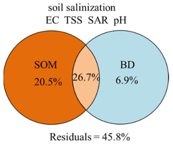 The structural equation model (SEM) was used to analyze the contribution of soil fertility factors (SOM, BD, MWD, SWC, and Ks) to soil salinization; the goodness of fit was 0.77, indicating a successful fit (Figure 7a). The soil salinization was directly influenced by SOM, BD, MWD, SWC, and Ks, for which standardized path coefficients were −0.77, 0.36, and −0.30 (p ≤ 0.05), −0.21, and −0.14 (p > 0.05), respectively. In addition, SOM significantly affected BD, MWD, SWC, and Ks, for which standardized path coefficients were −0.49, 0.43, 0.57, and 0.89, respectively. And Ks was directly and significantly influenced by MWD, for which the standardized path coefficient was 0.21 (p ≤ 0.05). The total standardized effects from the SEM showed that SOM, for which the total standardized effect was −0.70, was the most important explanatory variable for soil salinization, followed by BD, MWD, KS, and SWC, for which total standardized effects were 0.43, −0.311, −0.21, and −0.16, respectively (Figure 7b). The positive effect of BD to soil salinization was the greatest. And the negative effect of SOM for soil salinization was the greatest, and was 2.26, 3.31, and 4.28 times higher than those of MWD, KS, and SWC, respectively. In summary, SOM and BD were critical factors affecting soil salinization in these coastal saline lands. The results of variance decomposition showed that SOM explained more variations in soil salinization than BD, and the common effects of SOM and BD were greater than the independent influence of SOM on soil salinization in the coastal saline lands (Figure 8). Among them, SOM and BD jointly explained 26.7% of salinization variations, which was greater than the independent influence of SOM (20.5%) or BD (6.9%). For this reason, while improving saline soils, both SOM and BD must be taken into account simultaneously.