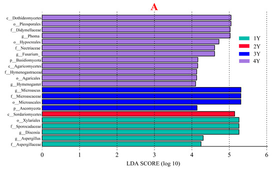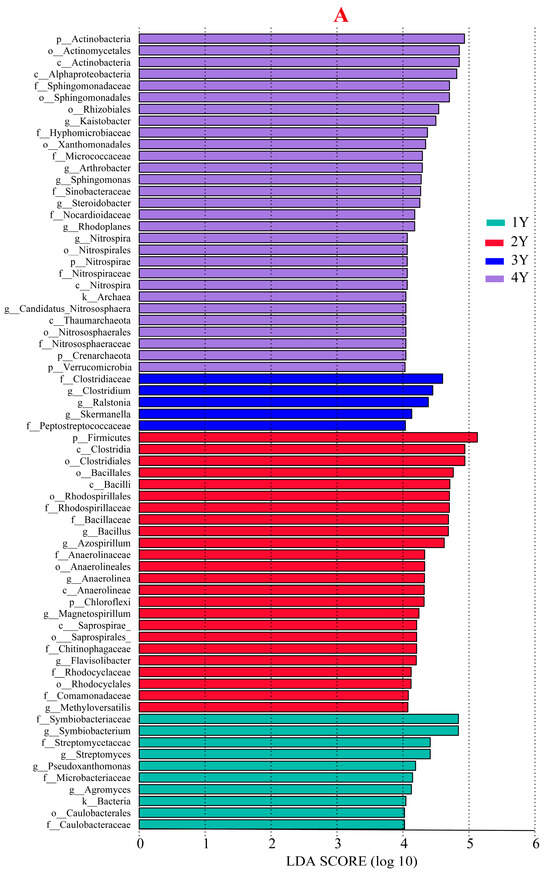 In this study, an LEfSe analysis was used to identify discriminative soil bacterial and fungal taxa among different CCYs. The results revealed that different bacterial taxa were enriched in each CCY (Figure 4). There were greater numbers of species enriched at the significant level (LDA > 4) in the 2-year (24) and 4-year (29) soils than in the 1-year (10) and 3-year (5) soils (Figure 4A). At the phylum level, high abundances of Symbiobacteriaceae (family), Streptomycetaceae (family), Agromyces (genus), and Pseudoxanthomonas (genus) were detected in the soil of 1 year. In the 2-year soils, Chloroflexi, including Anaerolineae (class), Ardenscatenales (order), Anaerolinaceae (family), and Anaerolinea (genus), showed a higher abundance; at the class level, Saprospirae, including Saprospirales (order), Chitinophagaceae (family), and Flavisolibacter (genus), presented relatively high abundances. Furthermore, Bacillaceae (family) and Rhodocyclales (order) presented relatively high abundances. However, in the 3-year soils, only Clostrdium (family) was present at relatively high levels. High abundances of bacteria (kingdom), including Nitrospirae (phylum), Nitrospira (class), Nitrospirales (order), Nitrospiraceae (family), and Nitrospira (genus); and Archaea, including Crenarchaeota (phylum), Thaumarchaeota (class), Nitrososphaerales (class), Nitrososphaeraceae (family), and Candidatus_Nitrososphaera (genus), were detected in the soil of 4 years; furthermore, the abundances of Micrococcaceae (family) and Sphingomonadales (order) were relatively high (Figure 4B).