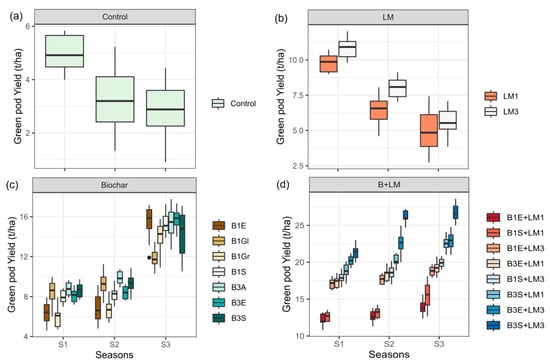 Effect of B amendments and LM on green pod yield, within (a) control, (b) LM plots, (c) B alone, and (d) B-LM. Bars represent values of four replicates and contain a standard error of means (n = 4). Bars with different letters differ significantly from each other at p < 0.05. B1E/B3E: Biochar produced from Eucalyptus wood and applied at 1 or 3 tons/ha. B1Gl: Biochar produced from Gliricidia wood and applied at 1 or 3 tons/ha. B1S/B3S: Biochar produced from Sesbania wood and applied at 1 or 3 tons/ha. B1Gr: Biochar produced from Grevillea wood and applied at 1 or 3 tons/ha. B3A: Biochar produced from Acacia wood and applied at 1 or 3 tons/ha.
