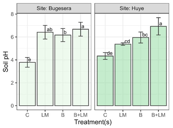 Effect of Biochar amendments and LM on Soil pH and Bars represents values of four replicates and contain a standard error of means (n = 4). Bars with different letters differ significantly from each other at p < 0.05.