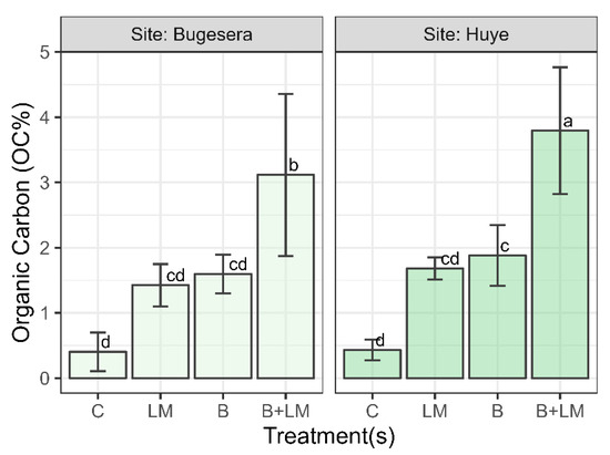 Effect of B amendments and LM on soil OC (percentage). Bars represent values of four replicates and contain a standard error of means (n = 4). Bars with different letters differ significantly from each other at p < 0.05.