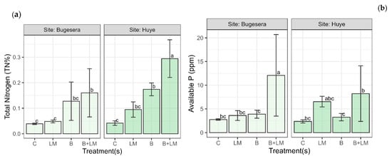 Effect of B amendments and LM on (a) soil TN (%) and (b) available P (ppm). Bars represent values of four replicates and contain a standard error of means (n = 4). Bars with different letters differ significantly from each other at p < 0.05.