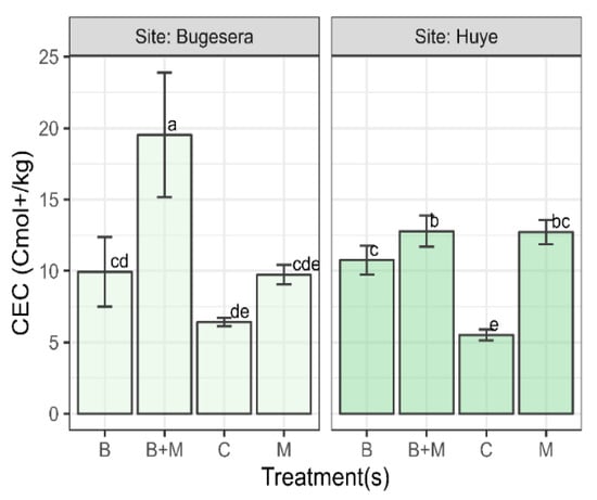 The effect of B addition on CEC (Figure 6) and the contents of exchangeable bases (Table S1) in studied soils are in Figure 6. The analysis of variance showed that CEC and exchangeable bases including Ca2+, Mg2+, and K+ were significantly (p < 0.05) increased by application of B with the highest increase recorded in the soil amended with B and LM at 3 t/ha (Table S1) and this increase in CEC results in increment of basic cations. On the other hand, B addition did not significantly affect Sodium (Na+). The soil CEC ranged between 17.89 and 8.1, 13.23 and 9.38, 24.05 and 11.42, and 6.42 and 5.51 cmol+/kg for B alone, LM alone, B + LM, and controls plots, respectively.