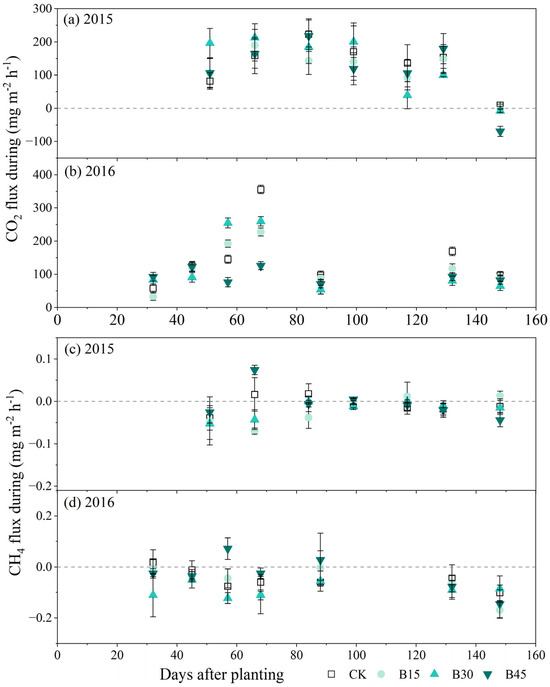 Soil CO2 fluxes and CH4 fluxes from maize production in 2015 and 2016 with biochar amendment. Biochar was only applied in 2015. (a,b) CO2 flux during in 2015 and 2016, respectively. (c,d) CH4 flux during in 2015 and 2016, respectively. The dashed line represents the boundary between greenhouse gas emissions and absorption, where positive values indicate emissions and negative values indicate absorption.