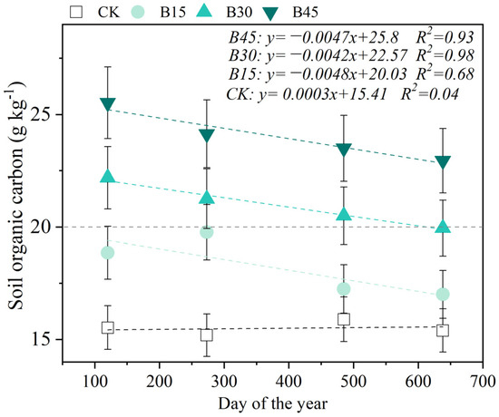 Biochar application initially increased the SOC content (Figure 6); however, over time, the SOC content decreased linearly with increases in the biochar application rate. Over 2015 and 2016, B15 increased the SOC content by 3.40 g kg−1 compared with the control, with a 0.91 g kg−1 increase in the first growing season. B30 and B45 increased the SOC content by 5.66 and 9.69 g kg−1 compared to the control, with a 0.94 and 1.08 g kg−1 reduce in the first growing season. In the dormant season. The SOC levels decreased in the biochar treatments, specifically B15, B30, and B45, with decreases of 2.5 g kg−1, 22.2 g kg−1, and 26.5 g kg−1 respectively, whereas no significant changes were observed in the control plots.