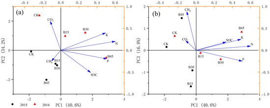Greenhouse gas emissions, soil fertility, and organic matter results under conditions wherein biochar was applied to maize were analyzed using principal component (PC) analysis (Figure 7) to obtain the optimal amount of biochar to be applied and the biochar replenishment time. The cumulative contribution of the three principal components accounted for 91.65%. PC1 mainly reflects soil fertility information. PC1 contributed 40.6% and exhibited a strong positive load of fertility indicators (N, P, K, SOC), along with a negative indicator for GHG emissions; By contrast, PC2 mainly reflects soil CO2 emission information owing to the indicator with a larger load being CO2. Similarly, the contribution of PC2 was 34.2%, with a positive N, K and CO2 indicator, and a negative P, SOC and CH4 indicator. Similarly, the contribution of PC2 was 34.2%, with positive N, K, and CO2 indicators and negative P, SOC, and CH4 indicators. In PC3. CH4 had a larger load than other indicators, primarily reflecting soil CH4 emission information. The PC3 contribution was 16.8%, with positive CH4, CO2, SOC, K, and N indicators and negative P indicators. The composite score in Table 4 shows that in 2015, B30 > B15 > CK > B45, and all scores are negative, whereas the composite score shows that B45 > B30 > B15 > CK in 2016.