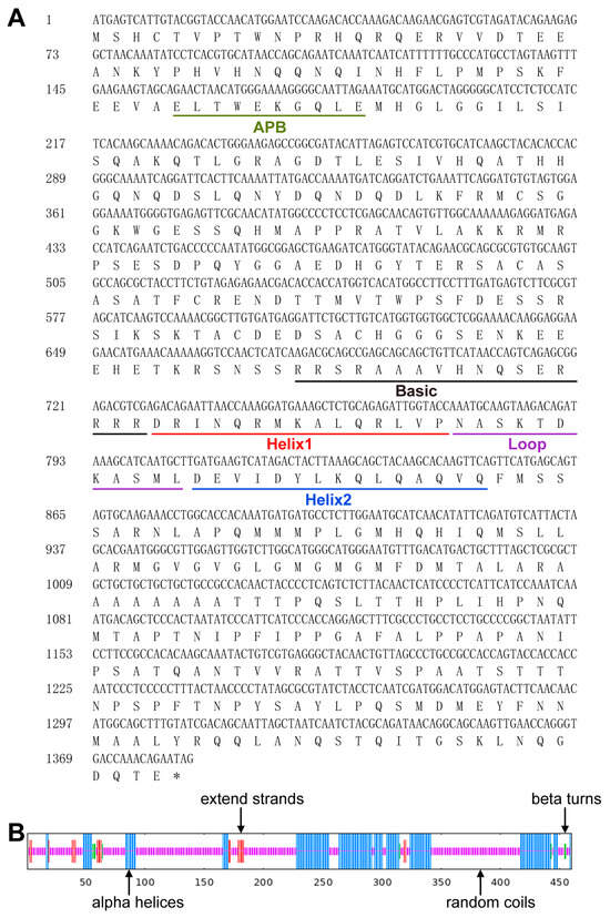 Characterization of pepper CaPIF7a gene and its encoded protein. (A) Nucleic acid and translated amino acid sequences of CaPIF7a. The conserved APB and bHLH domains were underlined with different colors. (B) Secondary structure of the CaPIF7a protein.