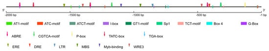 Predicted cis-acting regulatory elements in the promoter region of CaPIF7a gene by PlantCARE tool. Different shapes and colors represent diverse cis-elements.