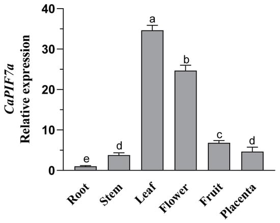qRT-PCR analysis of the relative expression of CaPIF7a in different tissues. Data represent mean ± standard error of three biological replicates, and different letters above the columns indicate significant difference (p < 0.05).