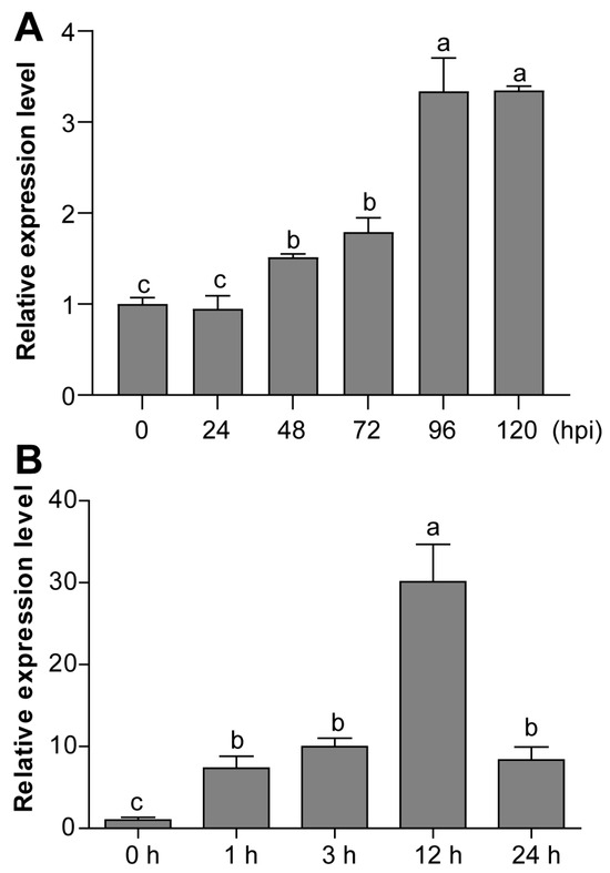 Expression analysis of CaPIF7a under PCI and SA treatment. (A) qRT-PCR analysis of the relative expression of CaPIF7a under PCI at different time points. (B) qRT-PCR analysis of the relative expression of CaPIF7a in response to SA treatment. Data represent mean ± standard error of three biological replicates, and different letters above the columns indicate significant difference (p < 0.05).