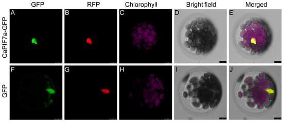 Subcellular localization of the CaPIF7a protein in Arabidopsis mesophyll protoplasts. (A,F) GFP fluorescence, (B,G) RFP fluorescence, (C,H) chlorophyll fluorescence, (D,I) bright field images, (E,J) merged images. Bar = 75 μm.
