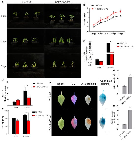 Virus-induced gene silencing (VIGS) of CaPIF7a increased pepper susceptibility to P. capsici infection (PCI). (A) Disease symptoms of TRV2:00 and TRV2:CaPIF7a pepper plants at 0, 3, and 7 dpi (days post infection). (B) Disease index determination in TRV2:CaPIF7a and TRV2:00 pepper plants. (C,D) Relative expression levels of CaPR1 (C) and CaPAL3 (D) in mock-treated and P. capsici infected TRV2:00 and TRV2:CaPIF7a plants. (E) The determination of SA content of TRV2:00 and TRV2:CaPIF7a pepper plants. (F) Phenotypes of detached leaves of TRV2:CaPIF7a and TRV2:00 pepper plants after inoculation with P. capsici. Bar = 1 cm. (G) Lesion area determination in TRV2:CaPIF7a and TRV2:00 pepper plants. (H) Relative P. capsici biomass in infected pepper leaves of TRV2:CaPIF7a and TRV2:00 pepper plants determined by qRT-PCR. Data represent mean ± standard error of three biological replicates, and the asterisks above the columns indicate significant differences (p < 0.05).