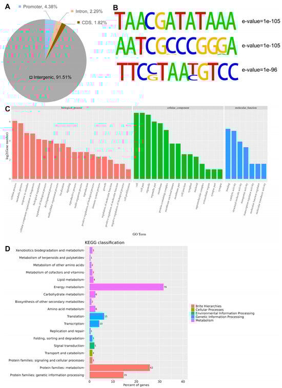 Genome-wide binding regions and enriched motif analysis of CaPIF7a by DAP-seq. (A) Distribution of CaPIF7a peaks in the pepper genome based on the localization of peak summits. (B) Significantly enriched motif sequence bound by CaPIF7a. (C) The result of GO functional enrichment. (D) The result of KEGG functional enrichment.