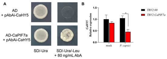 Amongst the bound genes of CaPIF7a, we found the light signal transcription factor CaHY5 (Capana08g000273), which was found to have a significant role in SA-mediated resistance of pepper plants against PCI [24]. Therefore, a yeast one-hybrid experiment was employed for checking whether CaPIF7a can bind to the promoter of CaHY5. As expected, CaPIF7a can bind to the promoter sequence of CaHY5 in yeast cells (Figure 8A). In addition, the expression of CaHY5 in the TRV2:CaPIF7a and TRV2:00 plants after PCI was examined using RT-qPCR. As shown in Figure 8B, the expression of CaHY5 was observably decreased in TRV2:CaPIF7a plants compared with the TRV2:00 plants at 2 dpi, while its expression had no significant differences between the mock-treated TRV2:00 and TRV2:CaPIF7a plants (Figure 8B). These results illustrated that CaPIF7a could activate the expression of CaHY5 by specifically binding to its promoter.
