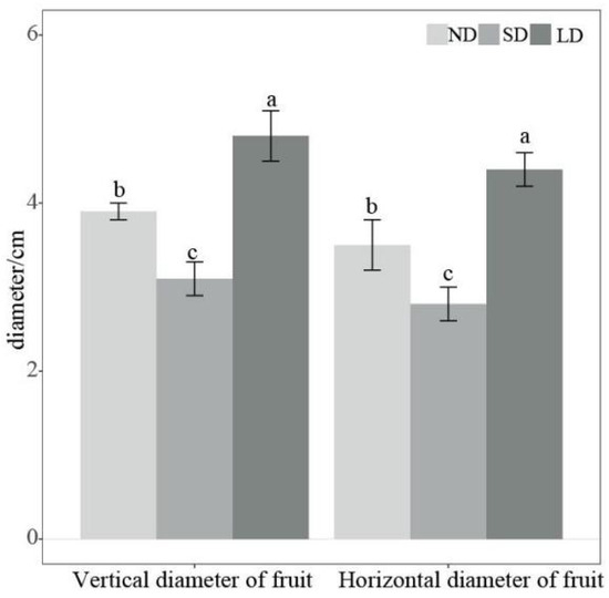 The final size of the fruits was measured during the ripening period of the first inflorescence of fruits. Fruit size (longitudinal and transverse diameters) under different photoperiodic treatments differed significantly (p < 0.05), as shown by LD > ND > SD (Figure 2); there was conical fruit under the ND treatment and more misshapen fruits under the short-day light treatment (Figure 3).