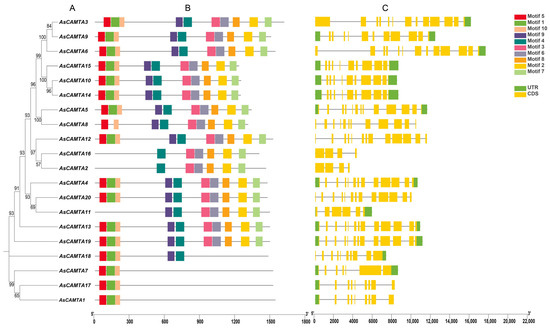 The gene structure and motif composition of the AsCAMTA family were explored through the analysis of their amino acid sequences using the MEME software (Figure 1). This led to the identification of 10 conserved motifs across the 20 AsCAMTA proteins, with individual proteins containing between 1 and 9 of these motifs. Specifically, AsCAMTA3, AsCAMTA9, AsCAMTA6, AsCAMTA15, AsCAMTA10, AsCAMTA14, AsCAMTA5, AsCAMTA12, AsCAMTA4, AsCAMTA20, AsCAMTA13, and AsCAMTA19 each contained all ten identified motifs. AsCAMTA8 had nine motifs; AsCAMTA11, seven; AsCAMTA16 and AsCAMTA2, six; AsCAMTA18, five; and AsCAMTA7, AsCAMTA17, and AsCAMTA1. Except for three members, AsCAMTA2, AsCAMTA11, and AsCAMTA16, all the other members have motifs 5 and 10. Additionally, the analysis revealed that genes grouped together on the evolutionary tree shared structural similarities and coding sequences (CDSs) with comparable numbers of introns. The positioning and lengths of these introns were consistent within groups but varied significantly between different groups, suggesting a correlation between gene structure and evolutionary lineage. In addition, genes on the same branch of the evolutionary tree are structurally similar and their CDSs have a similar number of introns. The position and length of the introns did not vary much within groups but differed significantly between groups.