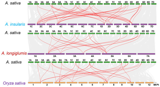 To further investigate the evolutionary lineage of the A. sativa CAMTA gene family, three comparative homology maps between A. sativa CAMTA members and three representative species were constructed, including two putative A. sativa ancestors (A. insularis and A. longiglumis) and rice, as depicted in Figure 3. These maps revealed extensive collinearity among the genes, indicating a close evolutionary relationship. Specifically, 102,298 collinearity pairs were detected between A. sativa and A. insularis, representing 69.66% of the total oat gene count. Similarly, A. sativa and A. longiglumis shared 180,373 collinearity pairs, accounting for the same percentage of A. sativa genes. In comparison, a total of 60,264 collinearity pairs were identified between A. sativa and rice, covering 32.03% of the A. sativa genome.