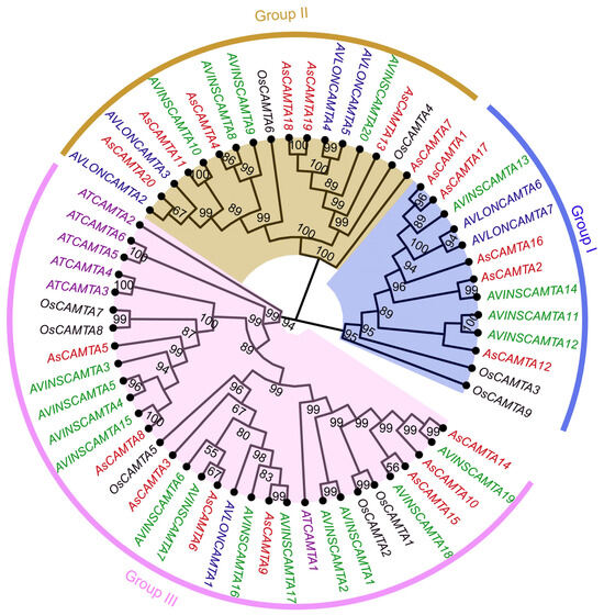 Phylogenetic tree analysis of the CAMTA proteins from A. sativa, A. thaliana, O. sativa, A. insularis, and A. longiglumis. The CAMTAs were divided into three clades (Group I–III) based on the clustering of the protein sequence.