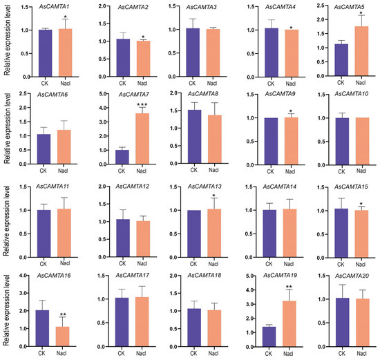 The expression patterns of 20 AsCAMTA genes were analyzed under salt stress by real-time quantitative RT-PCR. *, ** and *** represent significance levels of p < 0.05, p < 0.01 and p < 0.001, respectively.