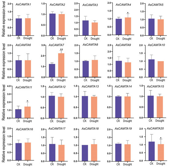 The expression patterns of 20 AsCAMTA genes were analyzed under drought stress by real-time quantitative RT-PCR. * and ** represent significance levels of p < 0.05 and p < 0.01, respectively.