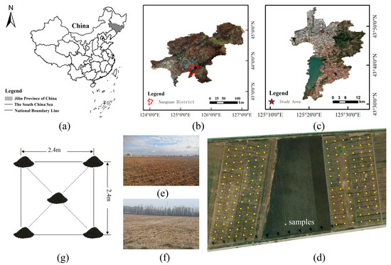 (a–c) The geographical location of Nanguan District, Changchun City, Jilin Province, China. (d) The distribution of 162 sample points in the study area. (e) Soil sampling reality of soybean-planted fields. (f) Soil sampling reality of corn-planted fields. (g) Five-point sampling method.