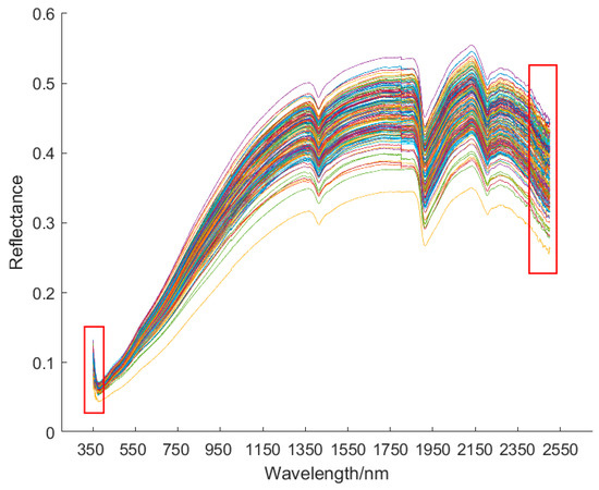 Original spectra. The red rectangles surround the noisy fringe bands 350–399 nm and 2400–2500 nm.