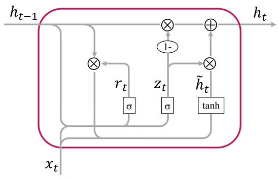 where σ denotes the sigmoid function, denotes the reset gate vector, denotes the update gate vector, tanh is the tanh activation function, is the moment, is the input vector, and and denote the hidden state and the candidate hidden state, respectively.