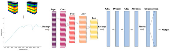 At present, a hot research area in machine learning is deep learning, which simulates the interaction between neurons in the human brain, recognizes patterns, and performs classification and prediction by training with a large amount of data. With the continuous advancement in deep learning technology and the improvement in data processing capabilities, studies have been conducted to use deep learning for remote sensing image classification [21,22,23,24], but there are very few applications in hyperspectral remote sensing for predicting SMC. Using hyperspectral data from soil samples in Xinjiang, Wang et al. [25] constructed a hybrid neural network model with a long short-term memory (LSTM) convolutional neural network (CNN) to identify the moisture and organic matter content; AHMED et al. [26] designed a hybrid model using GRU, adaptive noise full ensemble empirical modal decomposition, and CNN for daily time-step surface soil moisture forecasts. According to the investigation, convolutional neural networks and hybrid neural networks may accurately predict soil moisture and quantitatively estimate it.