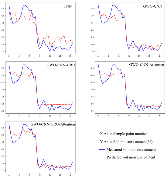 To construct the hybrid neural network model, the fitting effects of CNN, GWO-CNN, GWO-CNN-GRU, GWO–CNN–Attention, and GWO–CNN–GRU–Attention were compared and analyzed in the experiments, and the fitting plots of the prediction results were drawn using the predicted and measured values of the model (Figure 8).