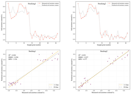 Figure 9 illustrates the comparison between the predicted and measured values of the two stacking models. Also, scatter plots were plotted for the two stacking models in Figure 9. The curve fit of the predicted and measured values is best for the Stacking2 model. Furthermore, the points created using the Stacking2 model’s projected values are substantially closer to the grey regression line, indicating the model’s higher predictive power. Figure 10 intuitively shows that Stacking2 obtains the highest R2 and RPD and lowest RMSE values, indicating that this model performs best in SMC prediction.
