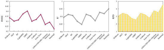 The prediction results of Stacking1 and Stacking2 outperform the base learners in all three evaluation metrics, indicating that the stacking ensemble learning method used in this study is effective and improves the prediction accuracy. However, the Stacking2 model demonstrates a stronger enhancement effect. Compared with the Stacking1 model, Stacking2 improves R2 and RPD by 3.2% and 1.041 and reduces RMSE by 0.067. It can be seen that adding GWO–CNN–GRU–Attention to stacking greatly improves the performance of the stacking model.
