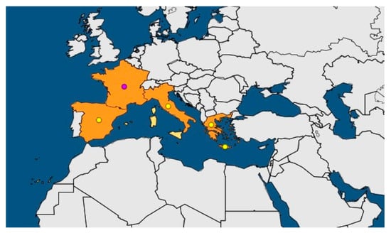 Distribution of X. chinensis in Europe. The species is present in Spain, Italy, and Greece (yellow dot), while in France it is transient (purple dot) (EPPO Global Database, 2023, www.gd.eppo.int, accessed on 30 June 2024).