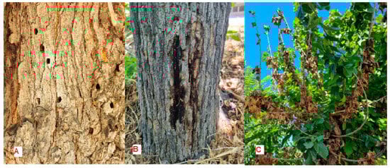 Symptoms of the pest damage in mulberry trees in the orchard of the Agricultural University of Athens, Greece. (A). Adult emergence holes of X. chinensis on the bark of a mulberry tree (B). Bark discoloration by the activity of the larvae of the pest (C). Dried sprouts on a mulberry tree in the orchard of Agricultural University of Athens.