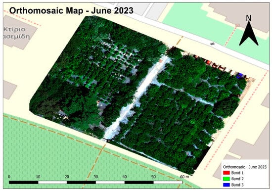 Orthomosaic maps (Figure 5), created from the DSM and DTM, comprised distortion-free orthophotos for detailed area representation. These maps are composed of smaller orthophotos and are constructed utilizing the spectral bands of the visible spectrum of electromagnetic radiation, specifically the Red, Green, and Blue (RGB). Each small orthophoto is precisely georeferenced, resulting in each pixel in the final map corresponding to a specific geographic point on the Earth’s surface with well-defined coordinates (X, Y, Z). The orthophotos essentially represent aerial images that have undergone correction processes to eliminate distortions induced by various factors, including lens characteristics, capture angles, and the Earth’s topographical variations. Therefore, the orthomosaic maps provide a highly detailed and accurate representation of the Earth’s surface, encompassing both natural and man-made features, all presented with high spatial resolution.