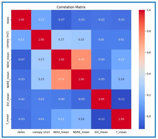 Table 1 provides a summary of the descriptive statistics related to the predictor variables in this study, including the number of holes, mean NDVI, mean NDRE, mean EVI, mean T, and canopy size (m2). Upon an initial inspection of variable values, conducted through both graphical representations and statistical tests, it was observed that there were no missing, duplicate, or extreme outlier values (Table 1).