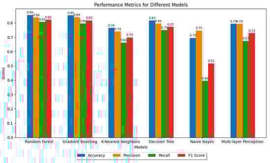 Figure 8 displays the metrics of the various algorithms employed. In terms of accuracy, the Random Forest model demonstrated the highest performance at 0.86, closely followed by the Gradient Boosting model with an accuracy of 0.85. The Decision Tree and Multi-Layer Perceptron models achieved accuracy values of 0.82 and 0.79, respectively. For the F-1 score, both the Random Forest and Gradient Boosting models achieved the top score at 0.82, while the Decision Tree model scored 0.77. Regarding precision, the Random Forest and Gradient Boosting models led with the highest values of 0.84, followed by the Decision Tree model at 0.80. According to the recall metric, the Random Forest model attained the highest value at 0.81, followed by the Gradient Boosting and Decision Tree models at 0.80 and 0.79, respectively. The K-nearest Neighbors and Naïve Bayes models exhibited the lowest metric values compared to the other models (Figure 8).