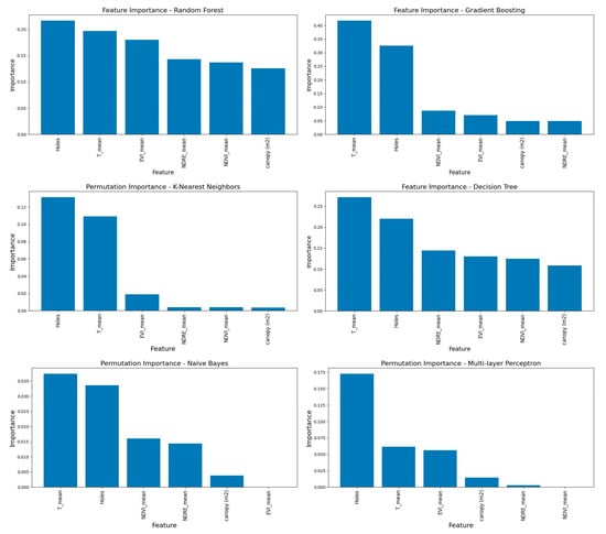 Remote sensing data from which vegetation indices were computed were also important factors for the prediction models. Among the models, EVI was the most important vegetation index predictor in three of them (Random Forest, K-Nearest Neighbors, Multi-Layer Perceptron), NDVI was the second most important in two of the models (Gradient Boosting, Naïve Bayes), and NDRE was the most important vegetation index predictor only in one model (Decision Tree). The main disadvantage of NDVI is its saturation in areas with high biomass and dense vegetation, which does not occur with EVI, making it more useful in such areas like the one in this study [45,46]. NDRE is more useful for detecting subtle changes in chlorophyll content, but NDVI is more efficient in large areas with dense vegetation [47]. In the Random Forest model, all the vegetation indices (EVI, NDVI, and NDRE) played an important role, without significant differences from the mean temperature and adult emergence hole factors. Moreover, the factor of tree crown area (canopy) had few differences from the NDVI factor. NDVI is correlated with crop biomass, so it makes sense that if NDVI plays an important role as a predictor in a model, the same will apply to the tree crown area (m2 of canopy) [40].