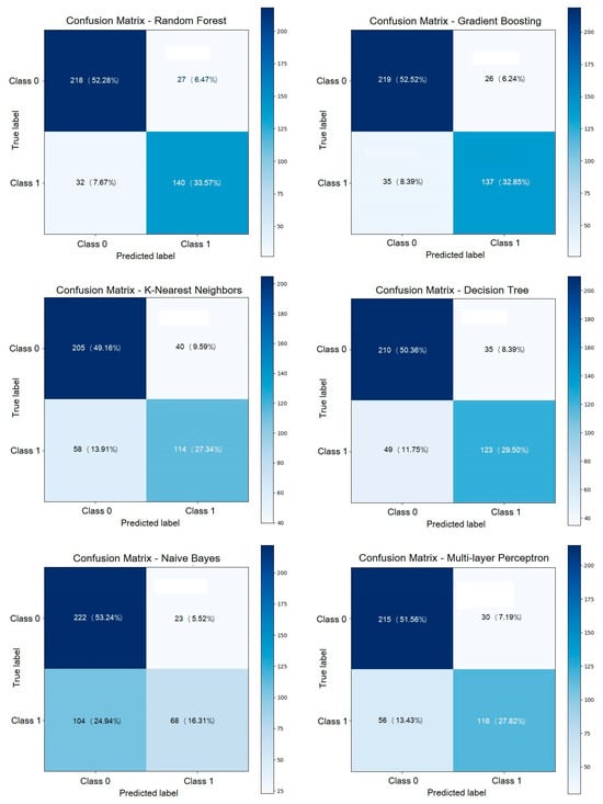 To assess the performance of the classification model, confusion matrices were employed (Figure 10). In these matrices, we observe that the percentages of the evaluated models ranged for true negatives from 49.16 to 53.24, while true positives ranged from 16.31 to 33.57. In both cases, the Random Forest and Gradient Boosting models exhibited the highest percentages.