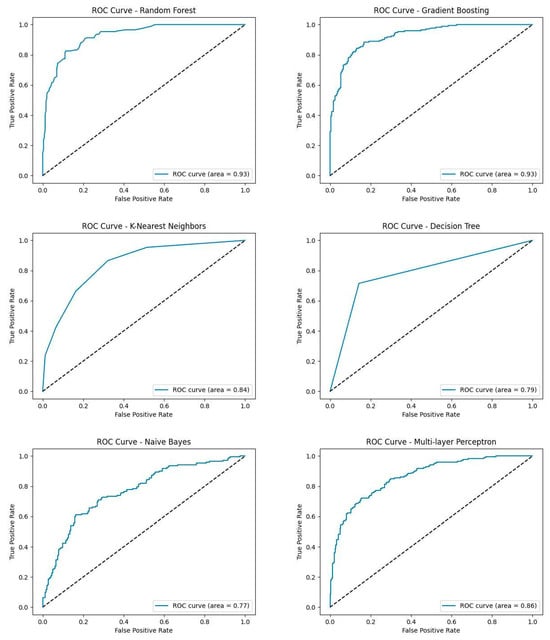 To assess and compare the performance of classifiers, Receiving Operating Characteristic (ROC) curves are employed (Figure 11). The closer the ROC curve is to the upper left corner of the graph, the higher the accuracy of the test because the greater the area underneath it, with the ideal ROC curve having Area Under the Curve (AUC) = 0.1. The dotted line shows the ROC curve of a random classification so below this line, the performance of the test is worse than random. In the graphical plots, it is apparent that the Random Forest and Gradient Boosting models demonstrated the highest area with a value of 0.93, followed by the Multi-Layer Perceptron and K-Nearest Neighbors models with areas of 0.86 and 0.84, respectively. The Decision Tree and Naïve Bayes models exhibit the smallest areas with 0.79 and 0.77, respectively.