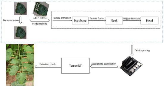 The whole inspection process is shown in Figure 1. The dataset was labeled using labelimg, resulting in a ‘.txt’ file. It was then split into a training set and a test set for model training, parameter adjustment, and evaluation. The data were trained using 640 × 640 size input images. The model was tested and examined for precision, recall, and other metrics. The enhanced model was exported to the ‘.onnx’ format for porting to the embedded system. Model acceleration optimization was performed using TensorRT (TensorRT8.0.2) on the embedded side. The detection work was finally carried out at the embedded end.