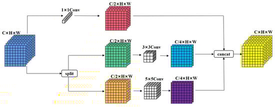 The module consists of three branches: The 1 × 1 convolutional branch, which is only used to adjust the number of channels of the input feature map, preserves the semantic features of the original feature map. After the 1 × 1 convolution, the output feature maps have half the number of channels compared to the input feature maps along the channel dimension. The 3 × 3 convolutional branch and the 5 × 5 convolutional branch perform the convolution operation on the input feature maps of different halves of the channels, respectively. After the 3 × 3 and 5 × 5 convolutions, the output feature maps have one-fourth the number of channels compared to the feature maps that did not undergo 3 × 3 and 5 × 5 convolutions, respectively. This approach reduces the computation required for each convolutional part. Finally, the feature maps after the 1 × 1 convolution, 3 × 3 convolution, and 5 × 5 convolution are subjected to splicing operations in the channel dimension to generate the final output feature maps. The module retains the original semantic features of the feature map, but also fuses the semantic features of different scales, while separately performing multi-scale convolution operations on the input feature maps on a different half of the channel, which reduces the amount of computation and the number of parameters, in line with the lightweight requirements.