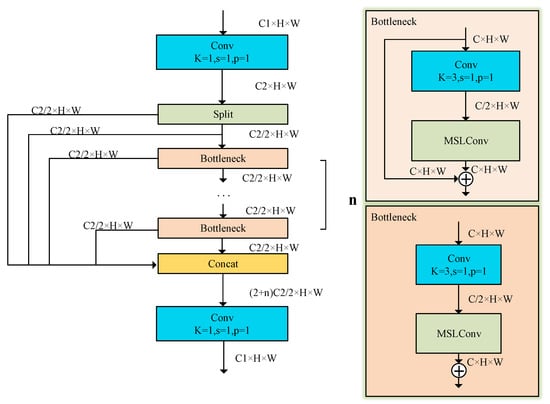 Using the same stacking idea as the original C2f, the LMSM was stacked as a submodule to generate a C2f-LMSM module to replace the C2f module in the neck network for feature fusion, as shown in Figure 4.