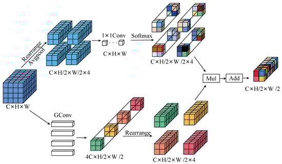 - The weighted feature maps constructed after average pooling are rearranged using the Rearrange operation, and the width and height of the rearranged feature maps are halved to achieve the same width and height as the feature maps of branch two; the 1 × 1 convolution is used to adjust the number of channels and increase the nonlinearities and to enhance the network for the interactions between the different features; then, the Softmax operation is performed to constitute the final attention;
