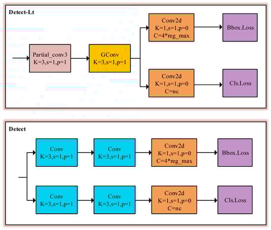 It was found that the composition of the head network of YOLOv8n has a large number of parameters, which increases the size of the model and also increases the inference time of the model. Therefore, in order to improve real-time performance, the head network must be lightweight. Here, a parameter-sharing idea was used, and the currently popular lightweight convolution was employed to redesign its head network, named Detect-L (Detect-Lightweight), as shown in Figure 6. This lightweighting approach did not significantly impact accuracy. The approach involves merging the convolution operations performed by the original two branches separately, using convolution parameter sharing. Its lightweight convolution uses partial convolution and grouped convolution, which are then branched to detect Bbox loss and Cls loss, respectively.